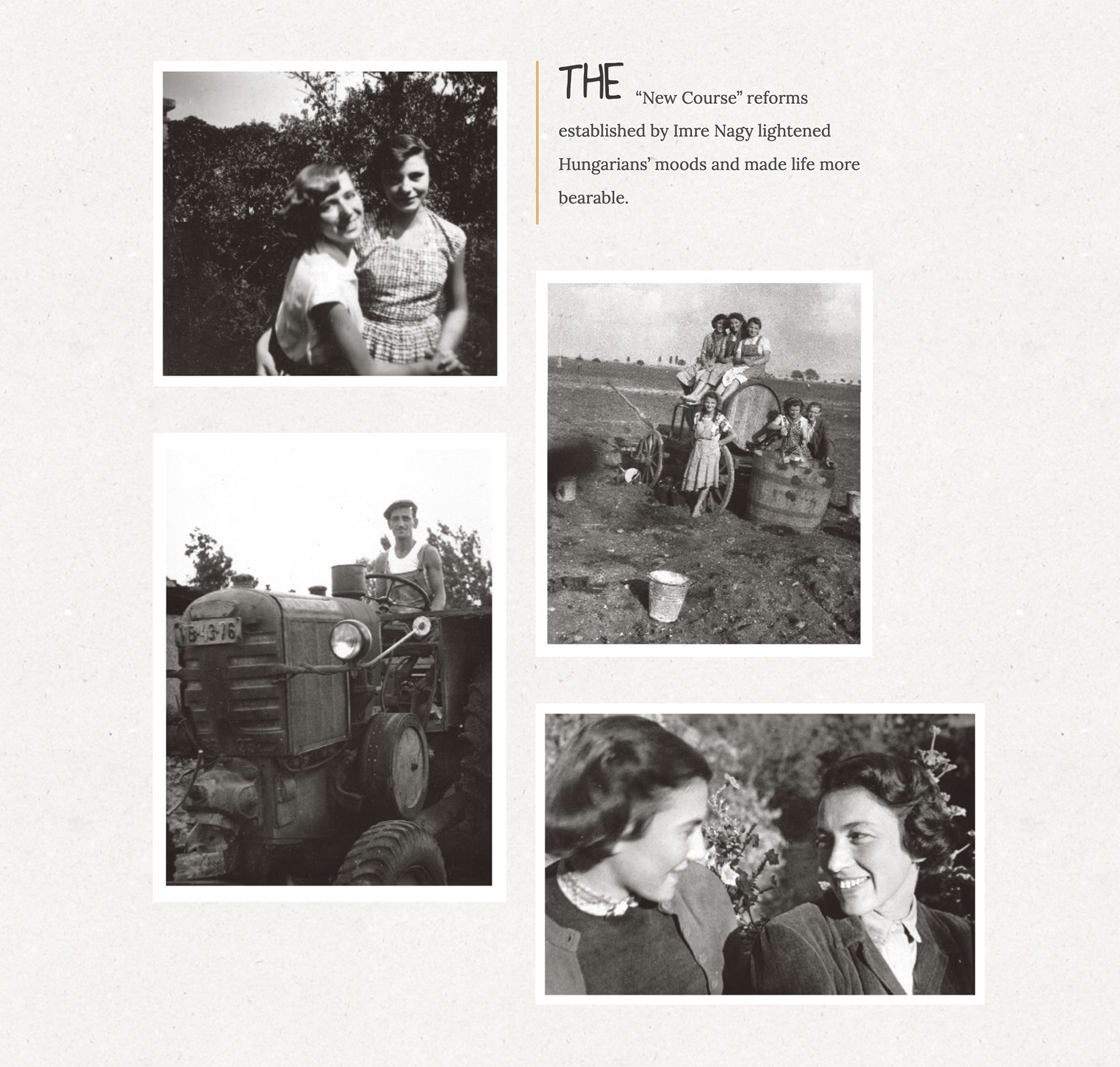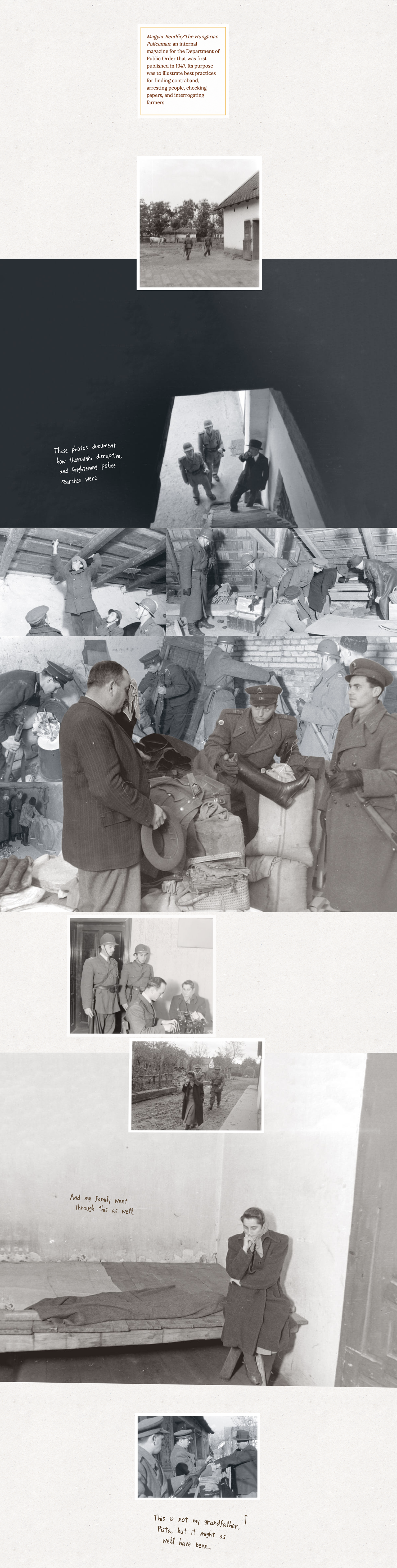 To illustrate this story, we carefully chose a vast assortment of nearly a thousand photographs that we have isolated into parts, put into animation, or crafted into photomontages. We have limited our use of the most iconic photographs and relied instead on alternative visual sources to document rural Hungary, including: the Fábos family’s own collection of photographs; the photographic collections of the Hungarian Ethnography Museum; the Fortepan digital archive of amateur photography, and the fascinating collection of images from the newsletter Magyar Rendőr (from the Hungarian Policeman Photo Archive). These images tell us a richer, more complicated history than the simple suggestion of a few iconic images.