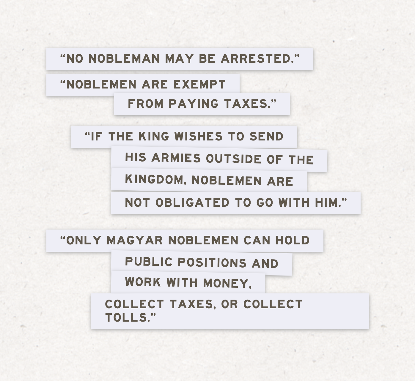 The strips of call-caps text on grey-tabs are voices of authority or quotes from government documents.