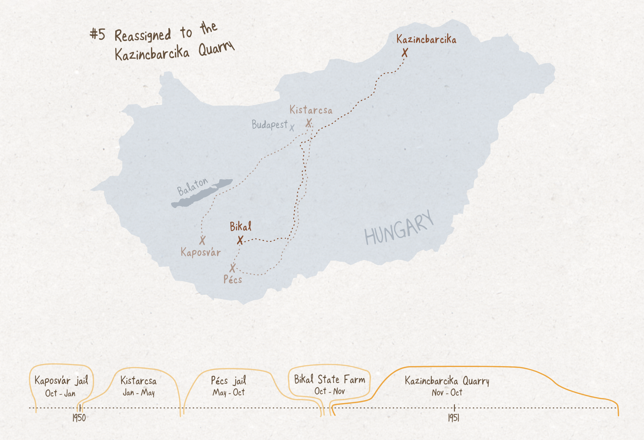 P&T 1945 a map and timeline detailing Pista’s two-year journey as a prisoner under the Rákosi regime