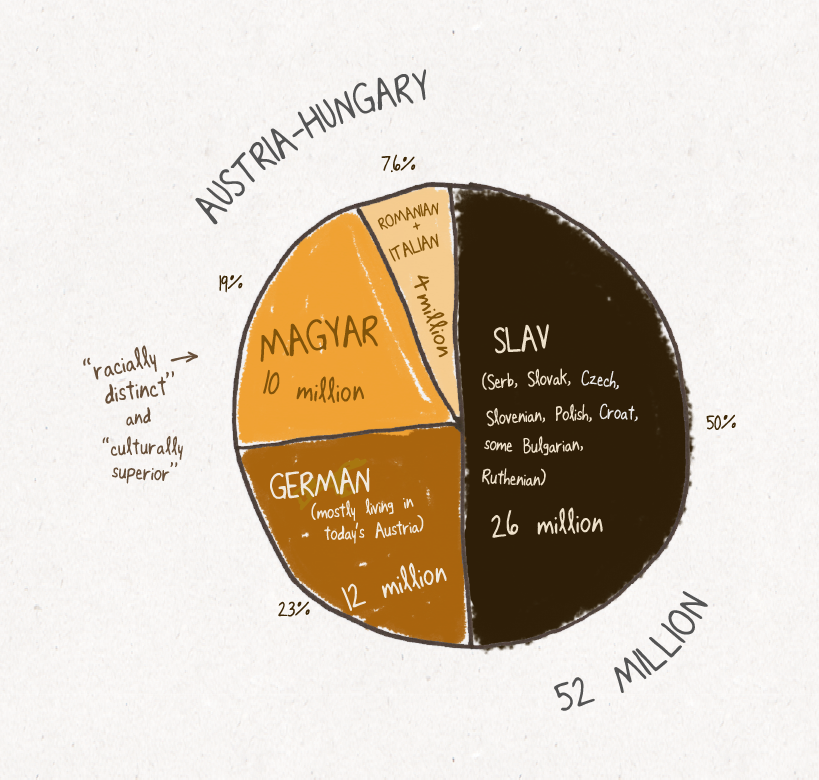 P&T 1900 pie chart showing the total populations of the largest ethnic groups in Hungary, this was to counters the idea that Magyar was THE Hungarian ethnicity