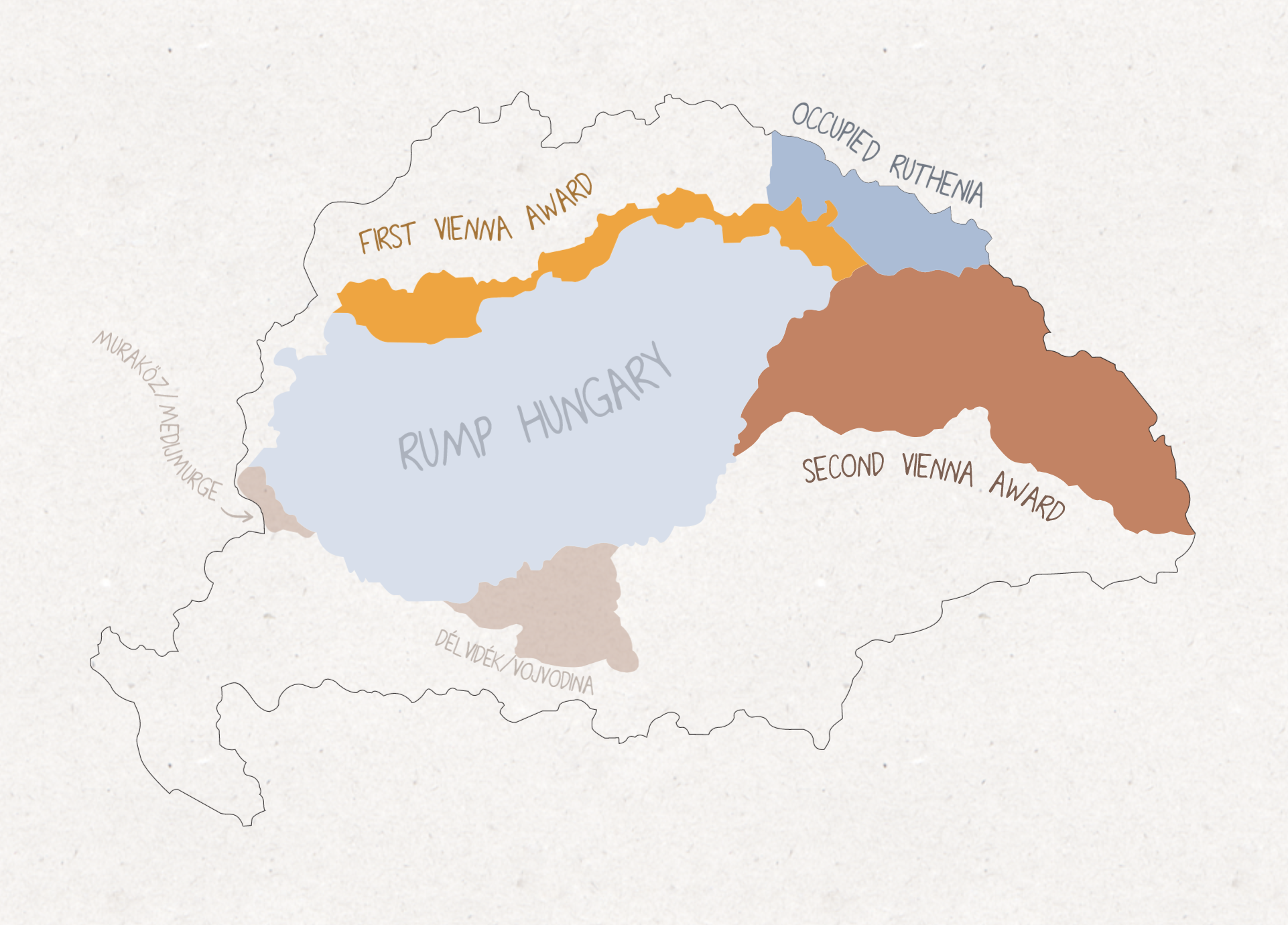 P&T 1940 a map showing the outline of the Hungarian border prior to the Treaty of Trianon, with land “awards” designated Hungary by Hitler during WWII