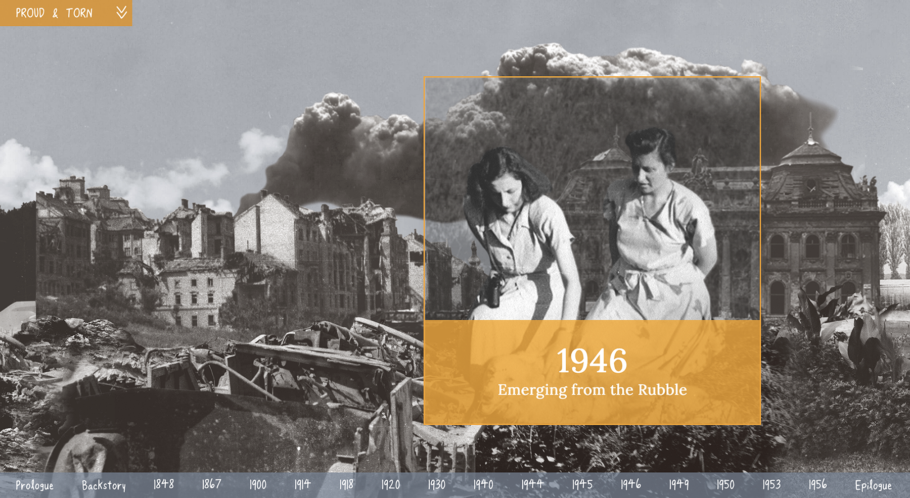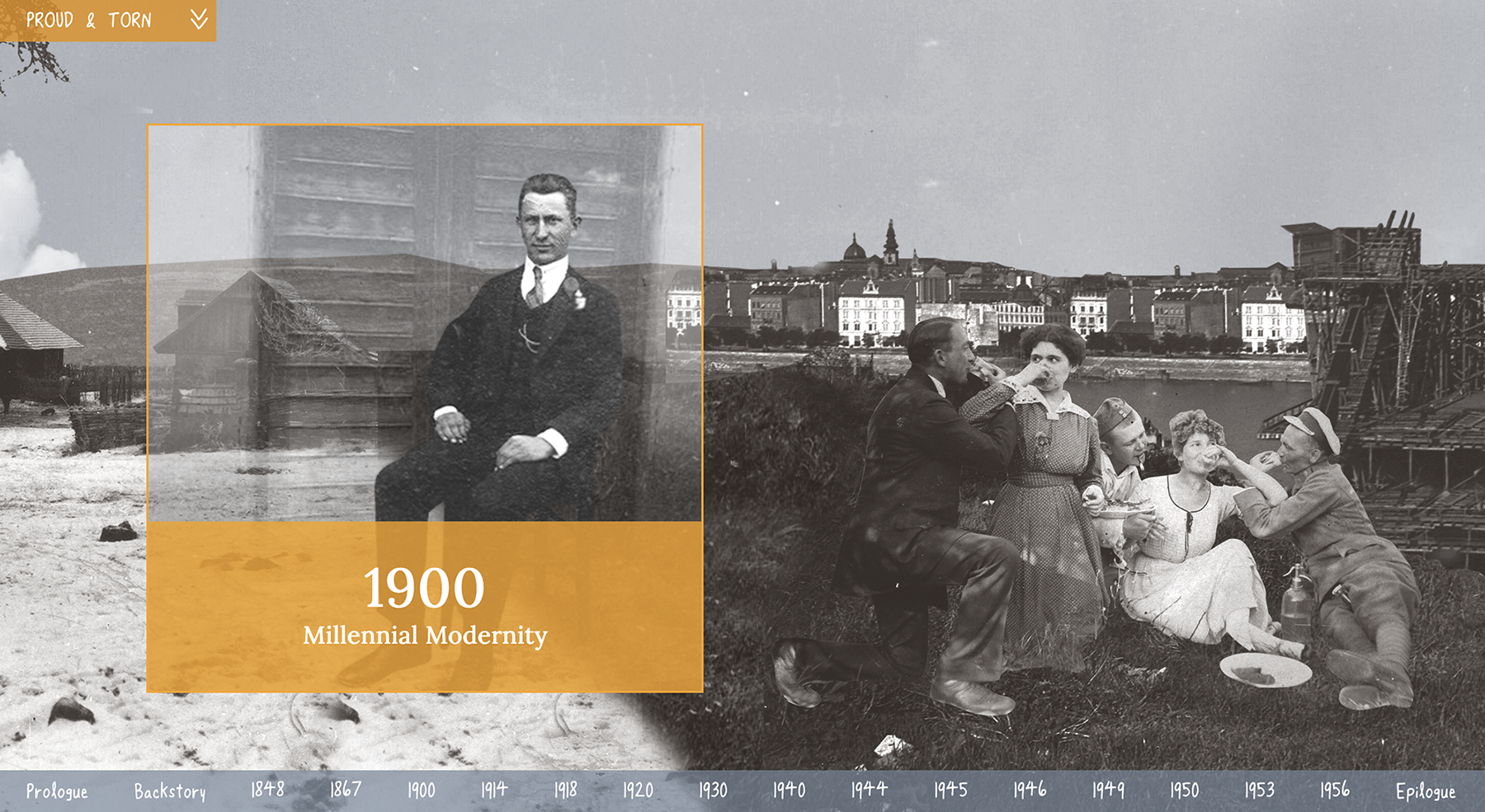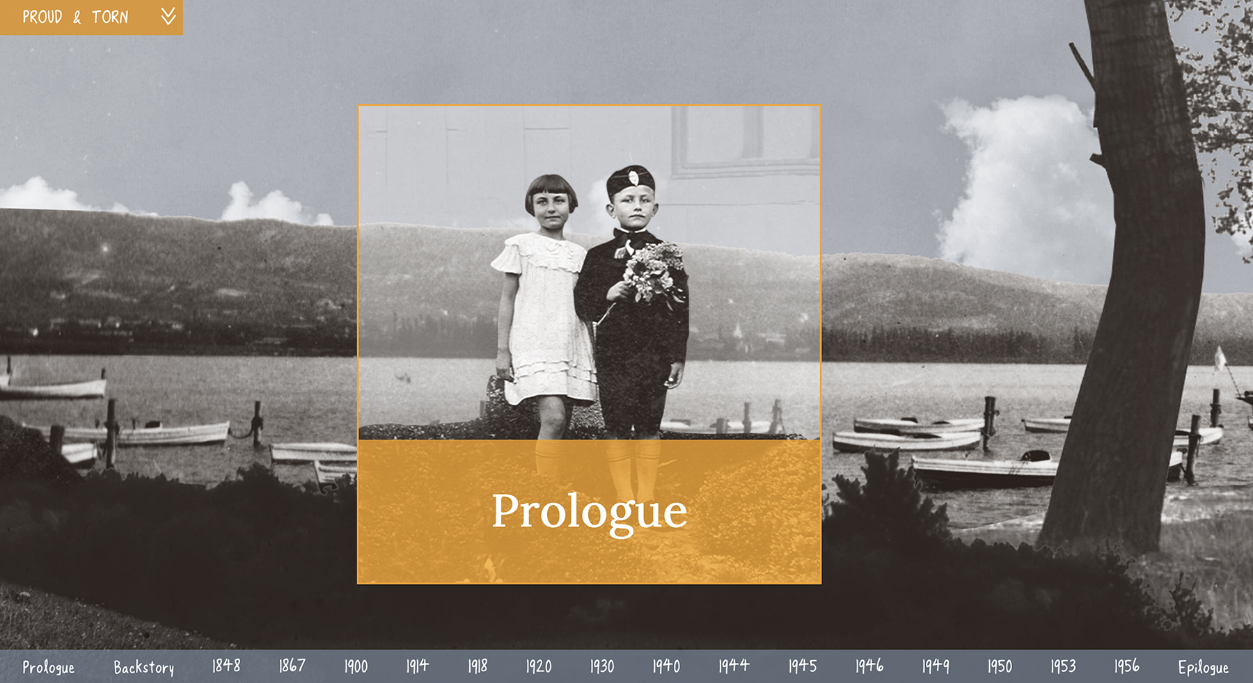 Scrolling down from the Proud & Torn landing page, the flow shifts from vertical to horizontal. A visually-rich timeline serves as an interactive table of contents. We move through a never-ending landscape, like a passenger on a train, across chronological chapters. Inspired by Richard Mcguire's graphic novel “Here” the landscape is the constant and square outcropped photos indicate windows to specific time-periods. The reader can hover over a time-marker and click to enter a chapter.