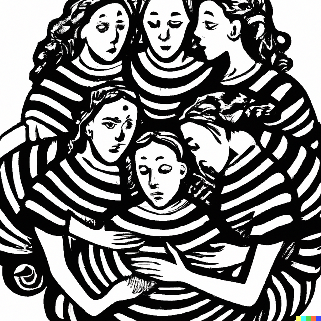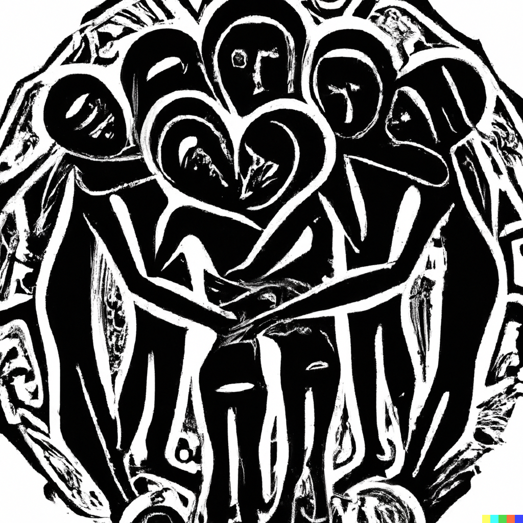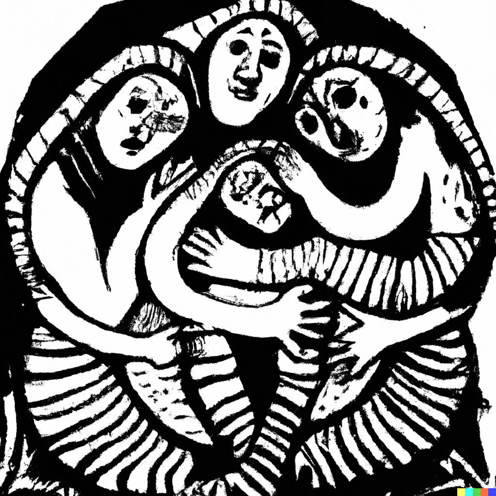 “five mothers huddled tightly in a circle around their children, arms holding each-other in, their bodies becoming like one, drawn with higly expressive mark-making, and rendered as a black and white woodcut” by DALL-E 2