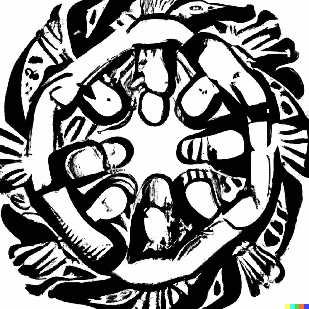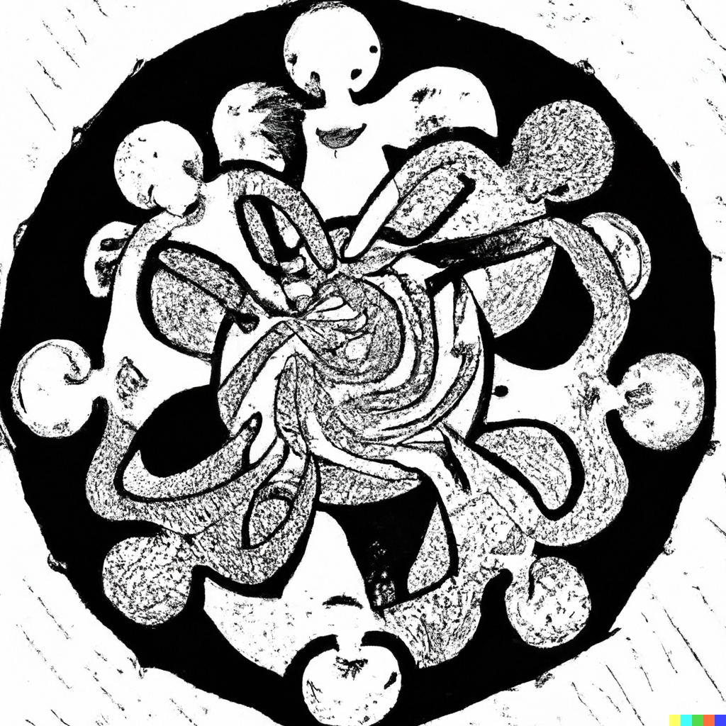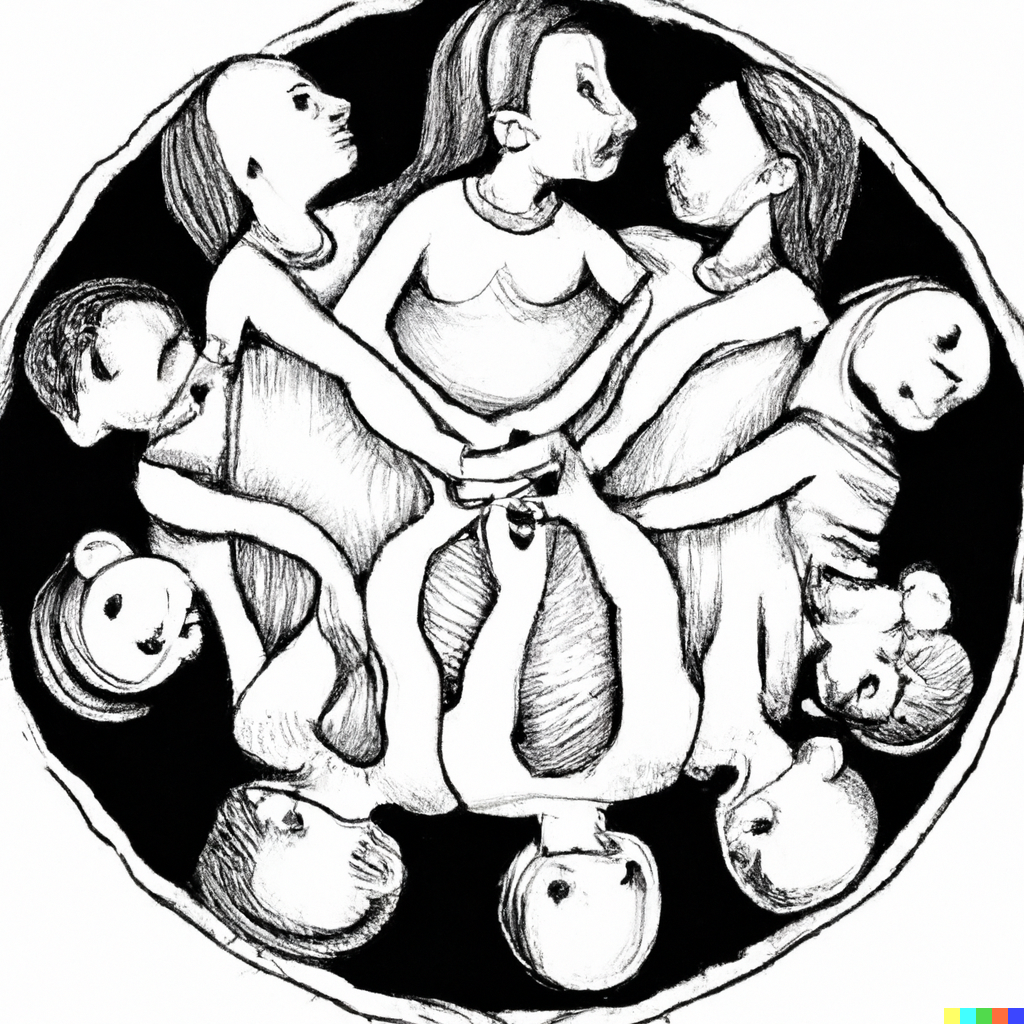“five mothers huddled tightly in a circle around their children, arms holding each-other in, their bodies becoming like one, drawn with higly expressive mark-making, and rendered as a black and white woodcut” by DALL-E 2
